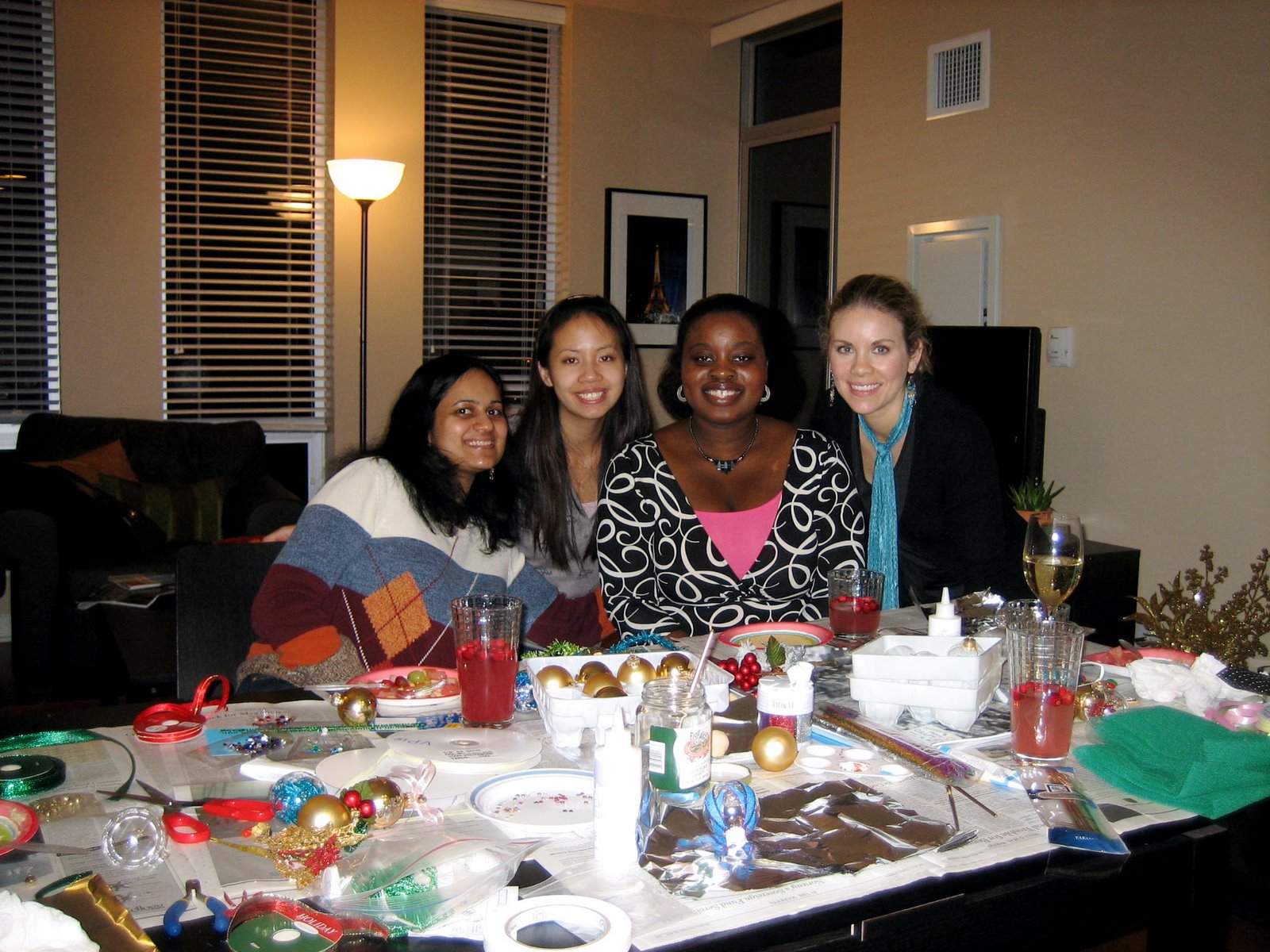 There are group of women who live in my "neighborhood" (the South Loop)--who have been having a few get togethers and plans for more. We are all "partners" of people who attend the GSB, so we have lots of nights without the guys around to hang out. Our most recent gathering was a Christmas ornament decorating night, complete with lots of glitter and varying amounts of creative abilities. Good times and more to come I'm sure....